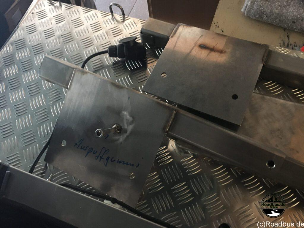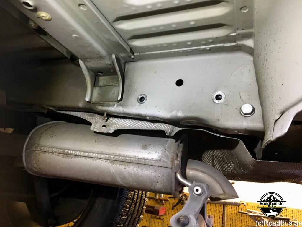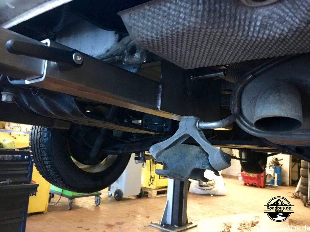 Befestigt wird die ganze Konstruktion an den originalen Schrauben der Anhängerkuppelung. Diese ist natürlich Bedingung für die Montage, da ja hier auch die Zusatzbeleuchtung angeschlossen wird. Die eigentliche Plattform des Trägers wird dann ganz einfach von hinten in die montierten Vierkantrohre eingeschoben und mit einem Knebel gesichert.
