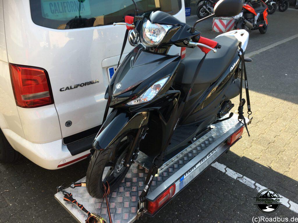 Meistens verwende ich den Träger zum Transport des Rollers. Es ist ein 110ccm Suzuki Address geworden. Mit einem eingetragenen Gewicht von 99kg bin ich nun legal unterwegs und hatte bisher keinerlei Probleme mit der zulässigen Achslast. Natürlich verändert ein solches Gewicht soweit hinter der Achse das Fahrverhalten und man kann nicht einfach wie früher um die Ecken flitzen. Der grösste Nachteil ist jedoch das die Vorderachse nun doch entsprechend entlastet wird. Ein Nachteil, der beim 4Motion sicherlich nicht so zum Tragen kommt. Auf einer Schotterpiste, und dann auch noch bergauf, ist deutlich spürbar.