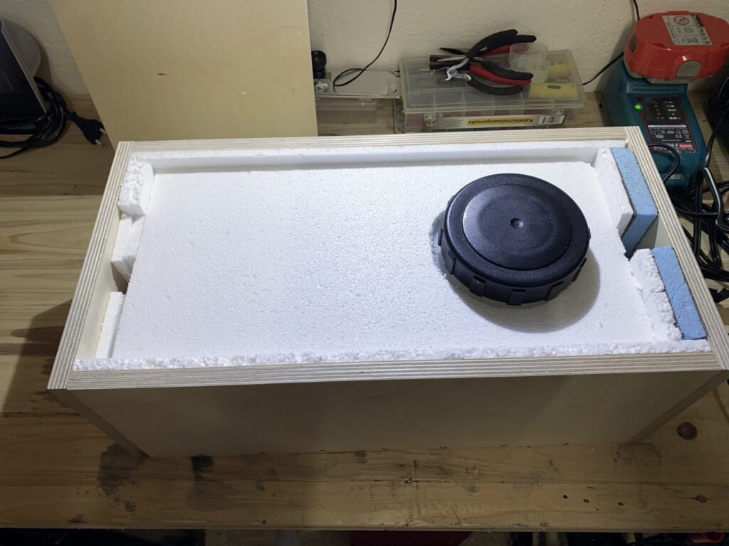 12 Liter Fassungsvermögen und die 3/4″ Gewindemuffe aus Messing im unteren Bereich des Tanks sind perfekt um hier den Heizstab von Rinsekit einzubauen. Der Rest war schnell erledigt. Eine passende Holzkiste aus 15 mm Birke Multiplex zusammengeschraubt und den Tank dort isoliert eingebaut.