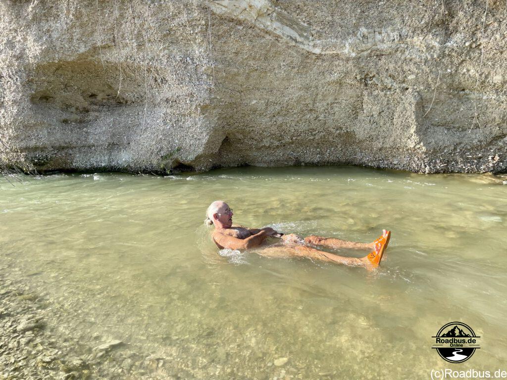 Wir stehen an einem kleinen Fluss, der um diese Jahreszeit sogar noch ausreichend Wasser führt, um darin zu baden. Die Zufahrt zum Flussbett ist wegen des losen Gerölls etwas tricky. Natürlich haben wir uns hier erst mal wieder richtig festgefahren. Gut, das wir uns mit dem Bergezubehör selber befreien konnten. Diesmal kommen die neuen Bergeboards zum Einsatz.