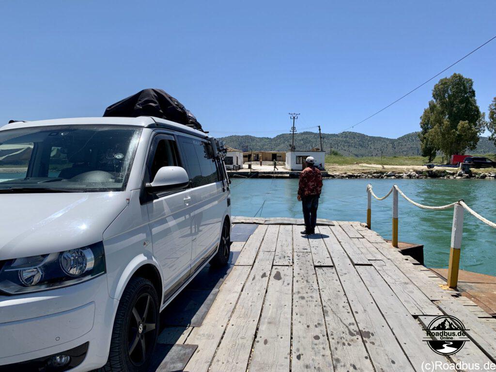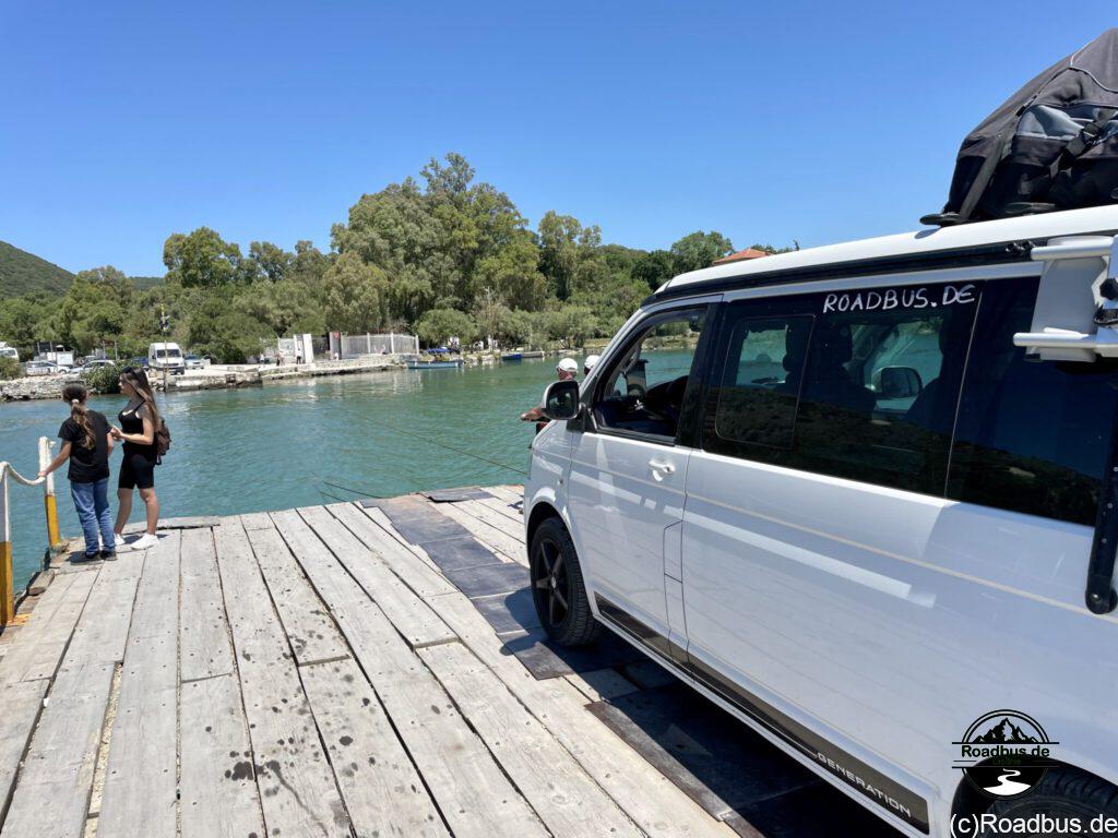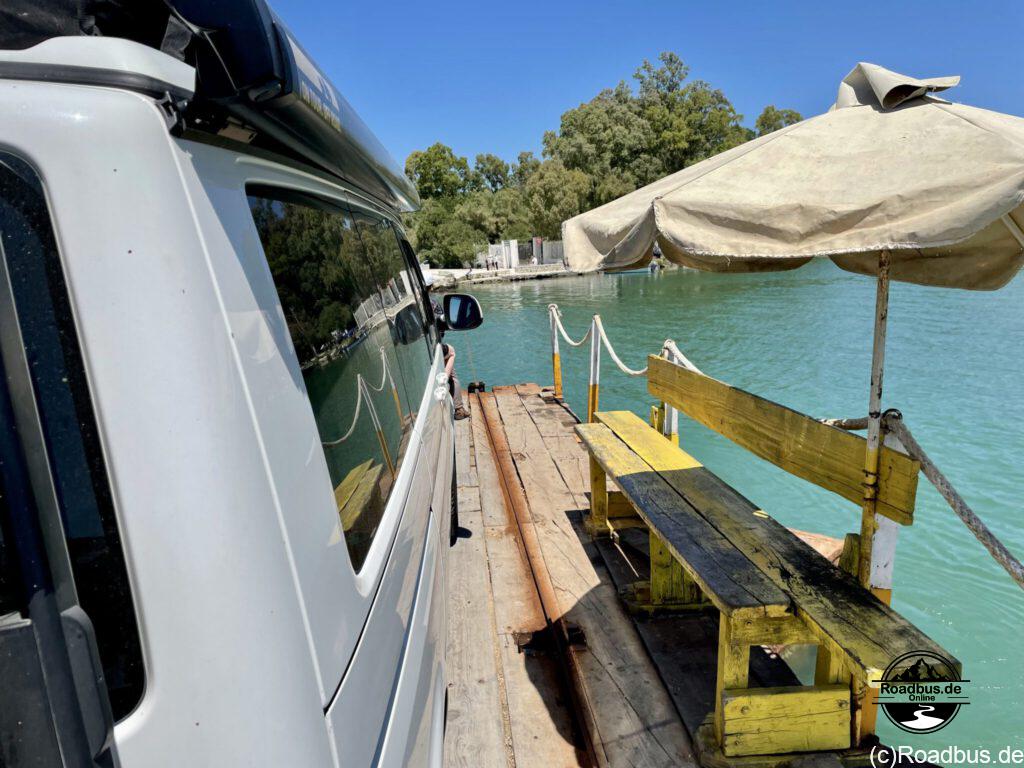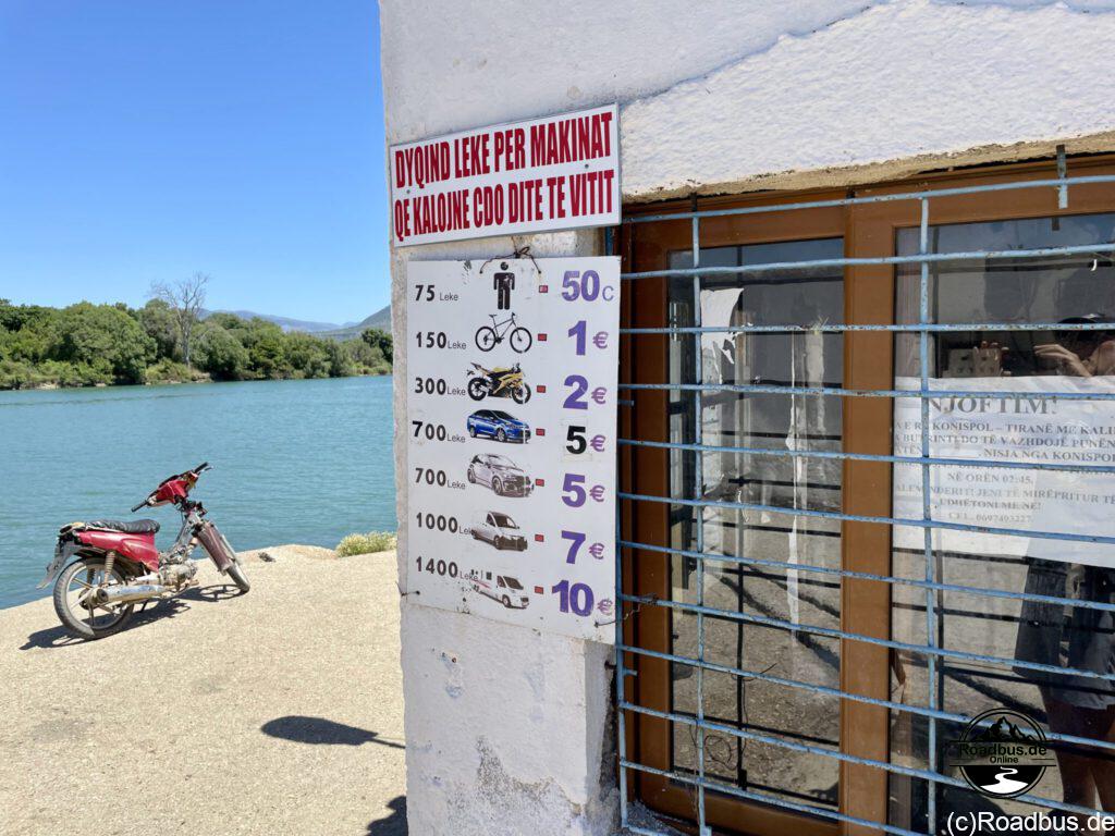 Wie fast überall in Albanien kann man hier mit Lek oder auch wahlweise mit Euro bezahlen. Wir gelten als Minibus und nicht als Wohnmobil und kommen mit 7€ davon. Auch wenn nur wenige Fahrzeuge gleichzeitig transportiert werden können, für die Betreiber scheint es ein einträgliches Geschäft zu sein.