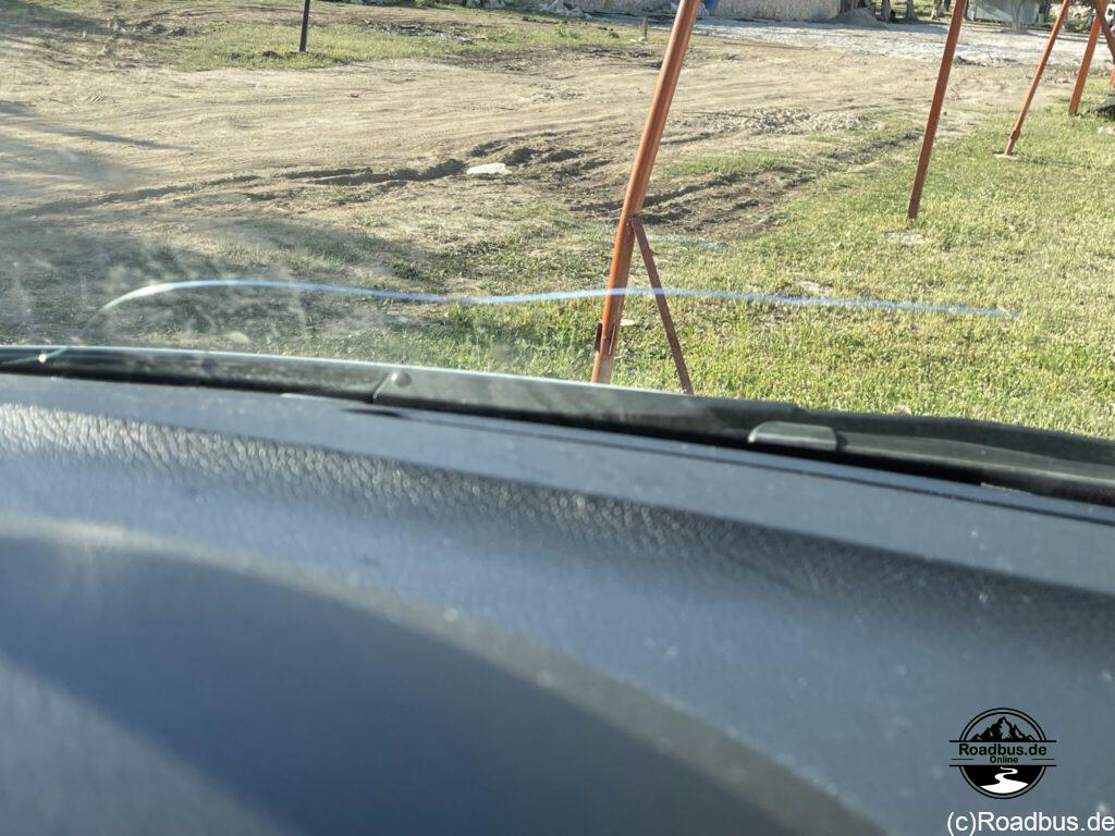 Der nächste Tag ist ein Freitag und wir können zunächst erst einmal mit der Versicherung telefonieren. Hier ist eine Freigabe der Reparatur dank Teilkasko schnell erteilt. Die 150€ Selbstbeteiligung sind zu verschmerzen. Aber wo bekommt man in Albanien eine Windschutzscheibe für einen California her? Das es sich bei unserem Cali um eine Akustikglasscheibe handelt macht die Sache bestimmt nicht einfacher. Neben den VW Auslandsnotdienst liefern mal wieder die „gelben Engel vom ADAC“ den entscheidenden Hinweis. Ein Tausch in Albanien ist nur in der Hauptstadt Tirana möglich. Im Land gibt es nur wenige dafür geeignete Werkstätten. Also wird uns die Rückkehr nach Griechenland empfohlen. In Ioannina, das etwa 150 km entfernt liegt, gibt es einen VW Vertragswerkstatt. Als wir dort anrufen um die Scheibe zu bestellen, stellt sich heraus, das es einen deutschsprachigen Mitarbeiter gibt, der viele Jahre in Hanover gearbeitet hat. Was für ein Glücksfall. Vasilis ist unser Telefon-Joker und ruckzuck sind all Modalitäten geklärt und die Scheibe bestellt. Das es dann doch nicht ganz so einfach wird, erfahrt Ihr im nächsten Teil meines Reiseberichtes.