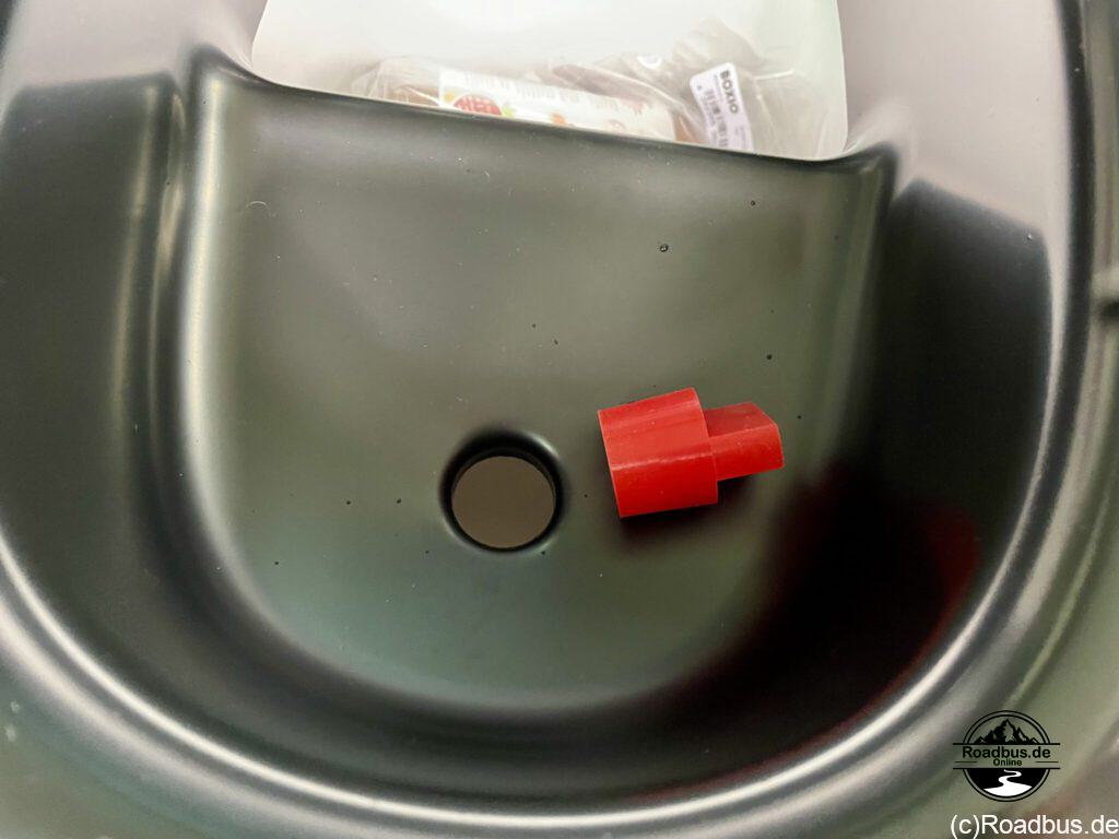 Bei beiden Herstellern ist für den Flüssigkeitenkanister noch ein Geruchsverschluss vorgesehen, damit das Pipi nicht riecht. Bei BOXIO setzt man ganz einfach einen Stopfen in das Loch. Praktischerweise ist dieser in rot, damit man ihn vor dem „Geschäft“ nicht vergisst. KoMa.Land setzt auf einen aufwendigeren automatischen Silikonverschluss, der aber aufwendiger zu reinigen ist.