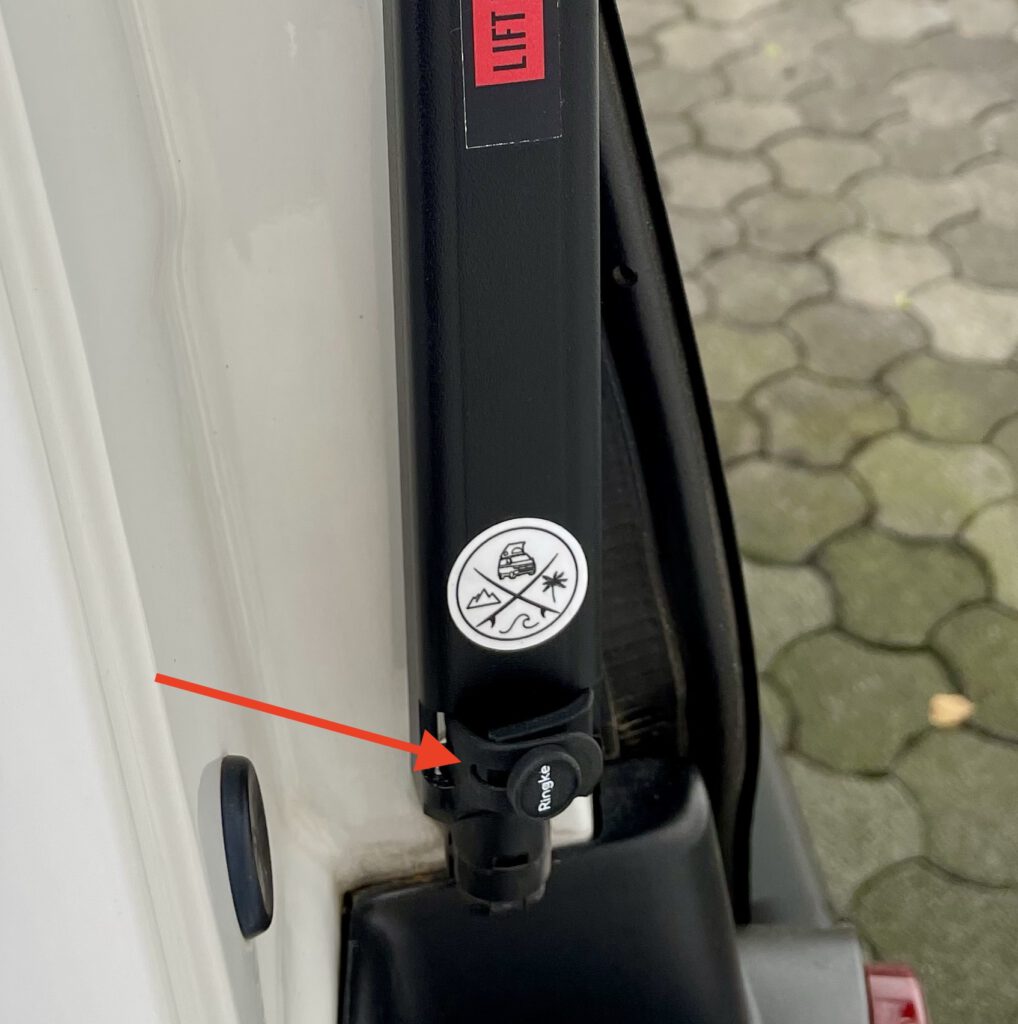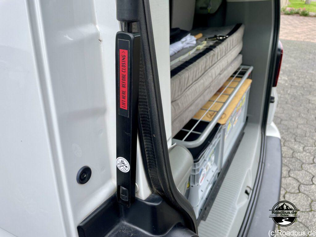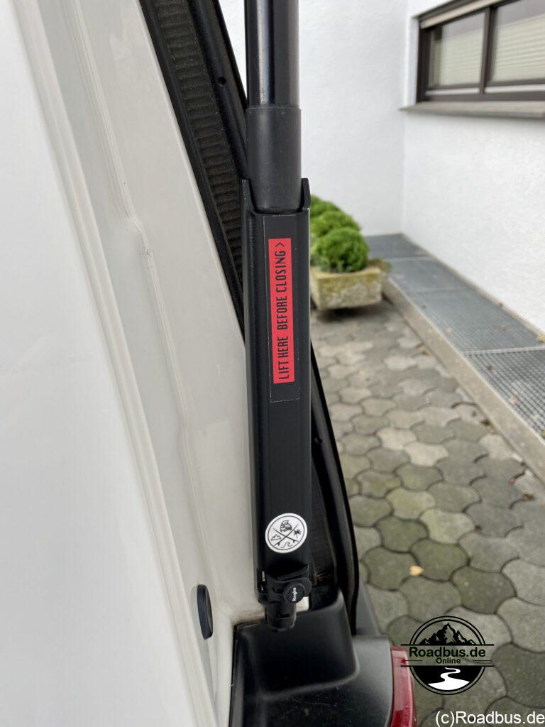 Hast du deinen Logo-Fahrradträger auch zum Lastenträger umgebaut? Dann kennst du das Problem vermutlich auch. Trotz verstärkter Dämpfer zum Öffnen der Heckklappe bleibt das Ding nicht oben oder fällt einem nach kurzer Zeit auf den Kopf. Auch wer mehr als zwei Fahrräder transportiert, hat in der Regel das gleiche Problem. Wir haben uns lange Zeit mit einem Abstandshalter zwischen Endanschlag und Dämpferzylinder beholfen. Oft war dieser nicht zur Hand oder lag nicht in Reichweite irgendwo im Bus.