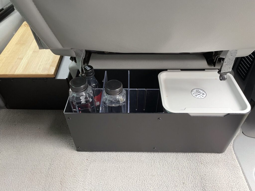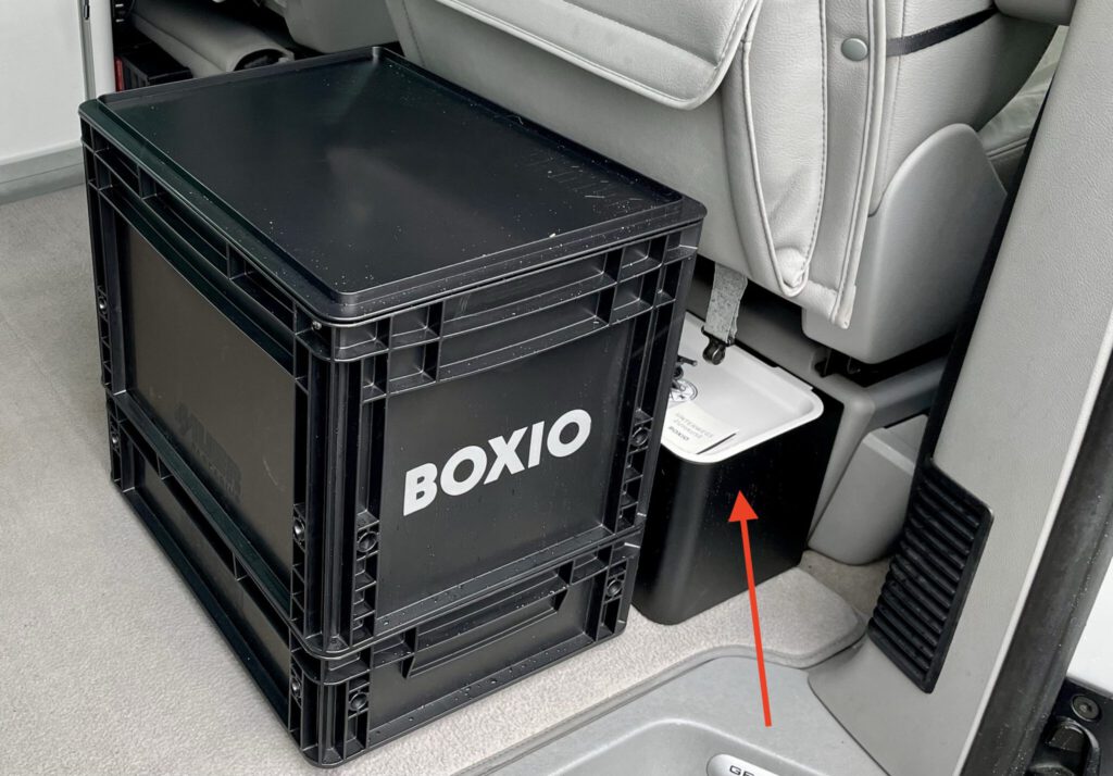 Vom Hersteller ursprünglich für den Bereich zwischen Fahrersitz und Küche vorgesehen, haben wir die Box zwischen die Toilette und den Beifahrersitz positioniert. Durch die Schräge der Rückenlehne entsteht hier zwischen Toilette und Sitzlehne ein bisher ungenutzter Raum. Dafür ist die Kiste einfach perfekt und wie dafür angefertigt. Gegen Verrutschen hilft bei dieser Box ein mitgelieferter Klettverschluss. Wer möchte, kann aber noch eine zusätzliche Befestigung an der Kunststoffverkleidung der Sitzkonsole anbringen. Dort ist das ja problemlos möglich ohne die Sitzkonsole anzubohren.