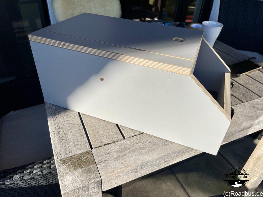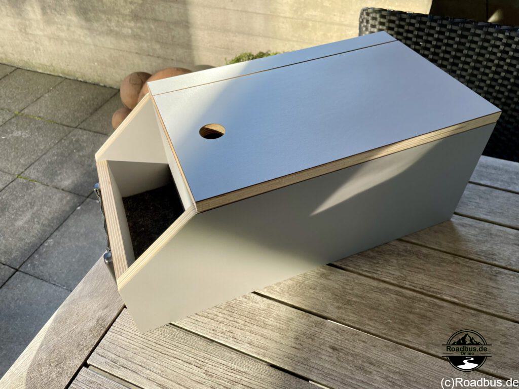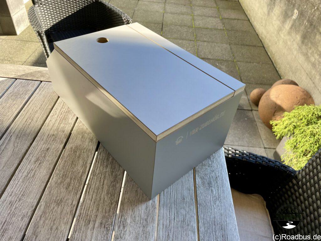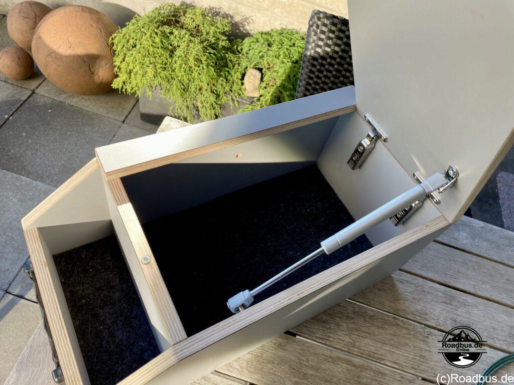 Und um den Stauraum im Roadbus noch mehr zu ergänzen, haben wir noch eine kleine Box hinzugefügt. Der bisher ungenutzte Bereich hinter dem Beifahrersitz ist perfekt für die Staukiste Nr. 1 von Grünthal.